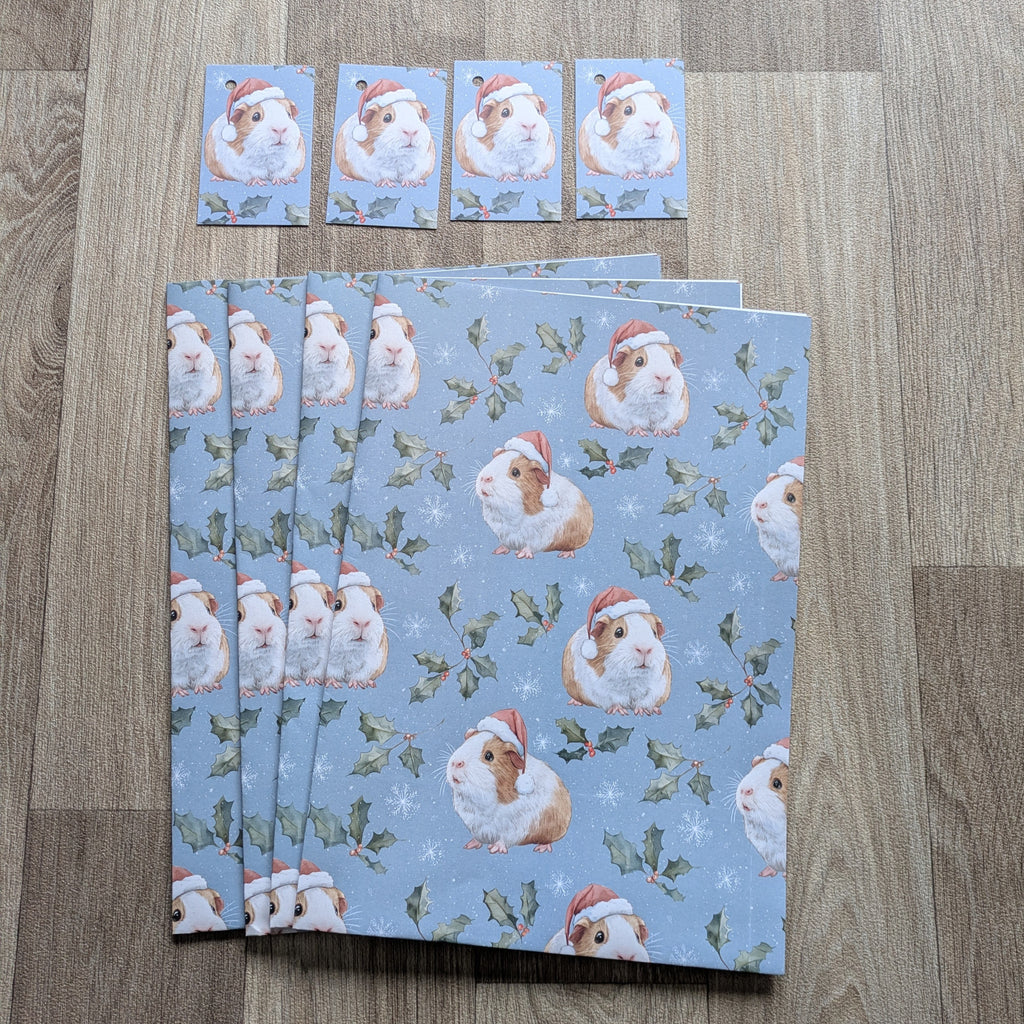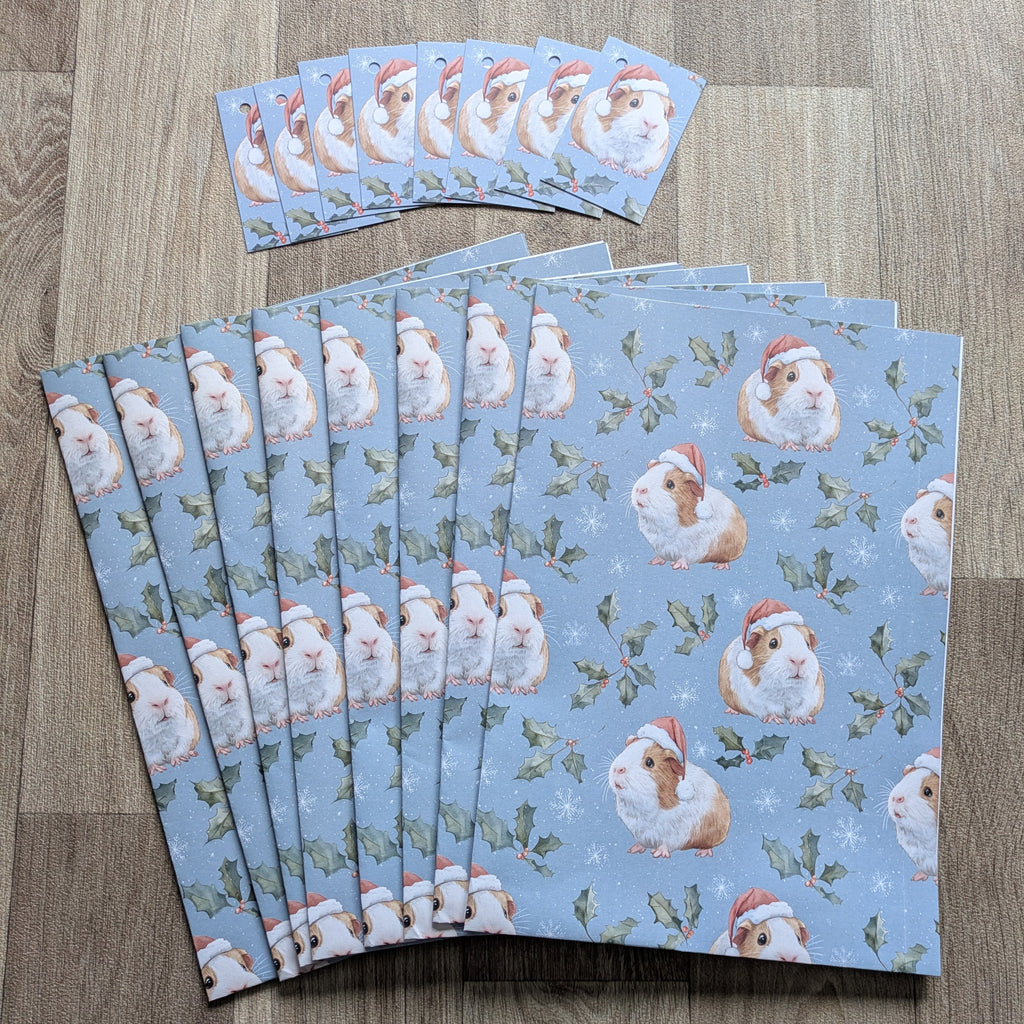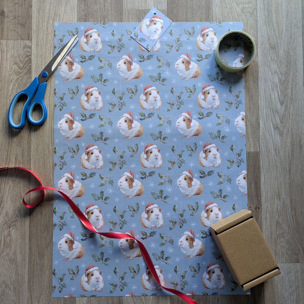 Guinea Pig Christmas Wrapping Paper and Gift Tag Set (Holly and Berries)