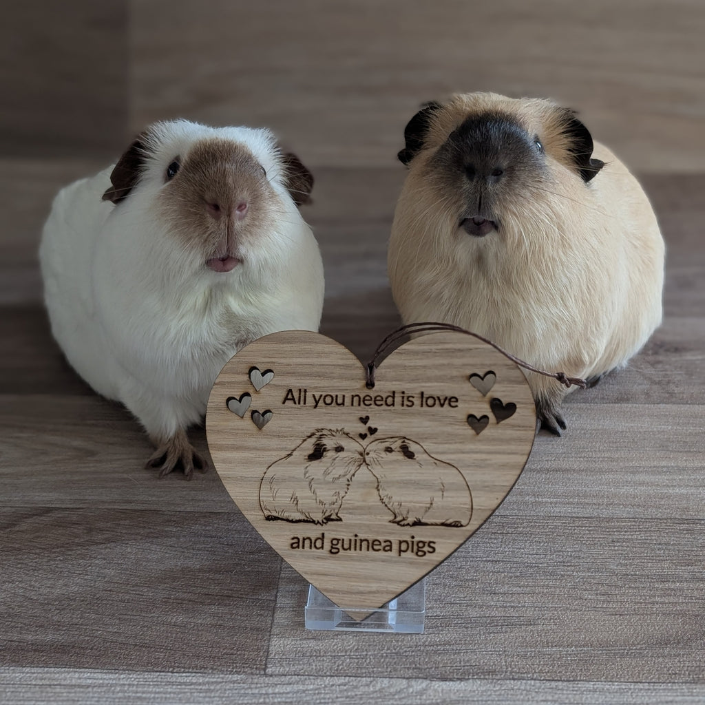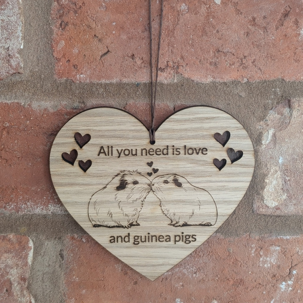 Perfect for adding a little squeak of guinea pig love to your home, our beautiful oak guinea pig decoration is a must for any piggy lover. Featuring the wording 'all you need is love and guinea pigs' our engraved wooden heart would make a wonderful anniversary or Valentine's Day gift.